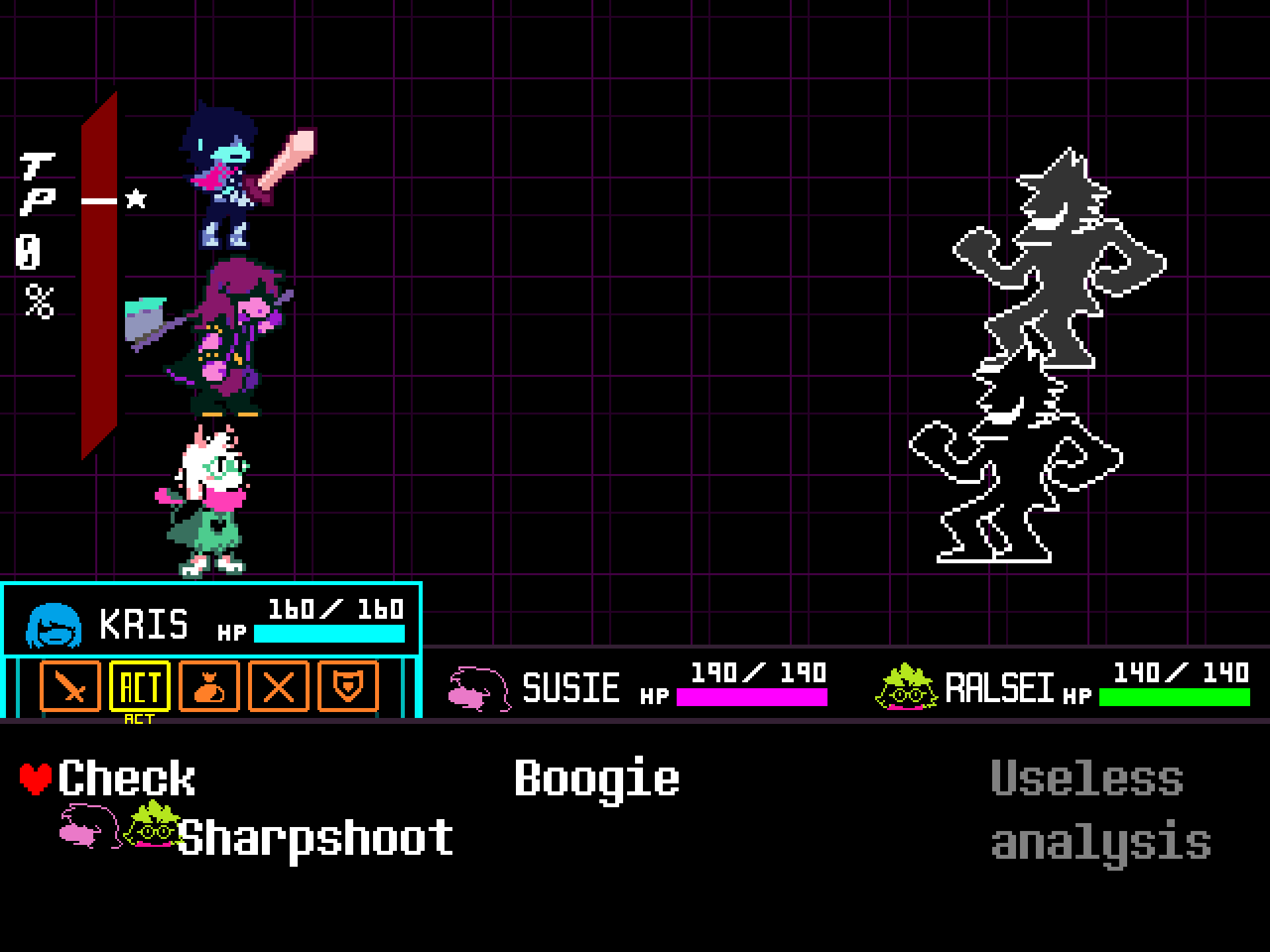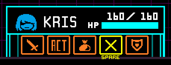 If you want to play the game nonviolently (I assume this is most of you), then Kris's second battle command, ACT, is most important. It's not in the first position because choosing this should always be a conscious effort from you (sorry if you end up choosing FIGHT by mistake.)