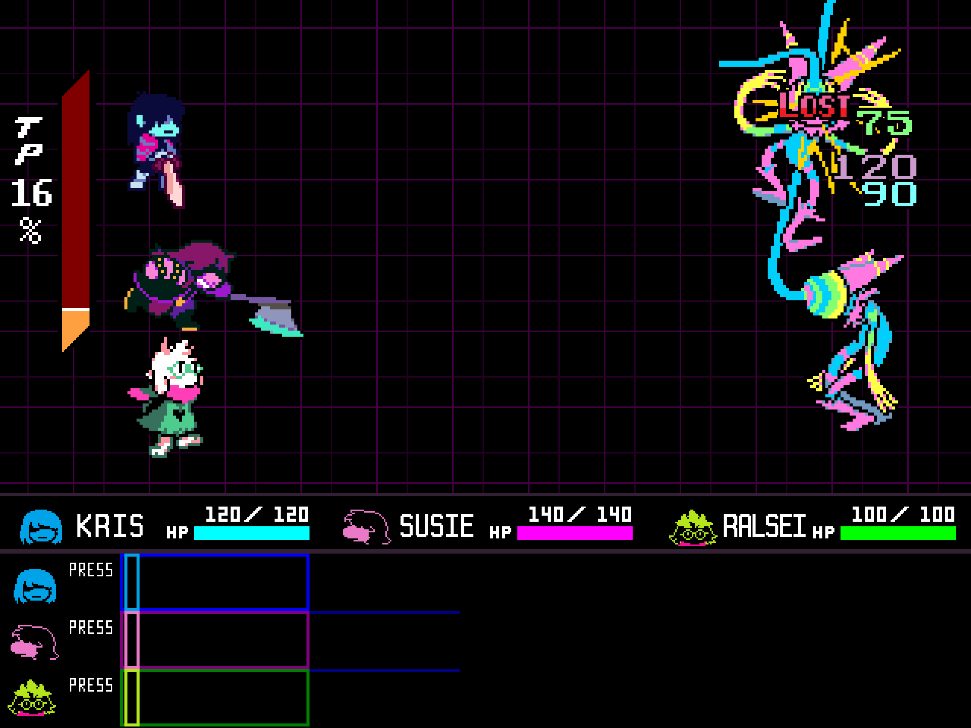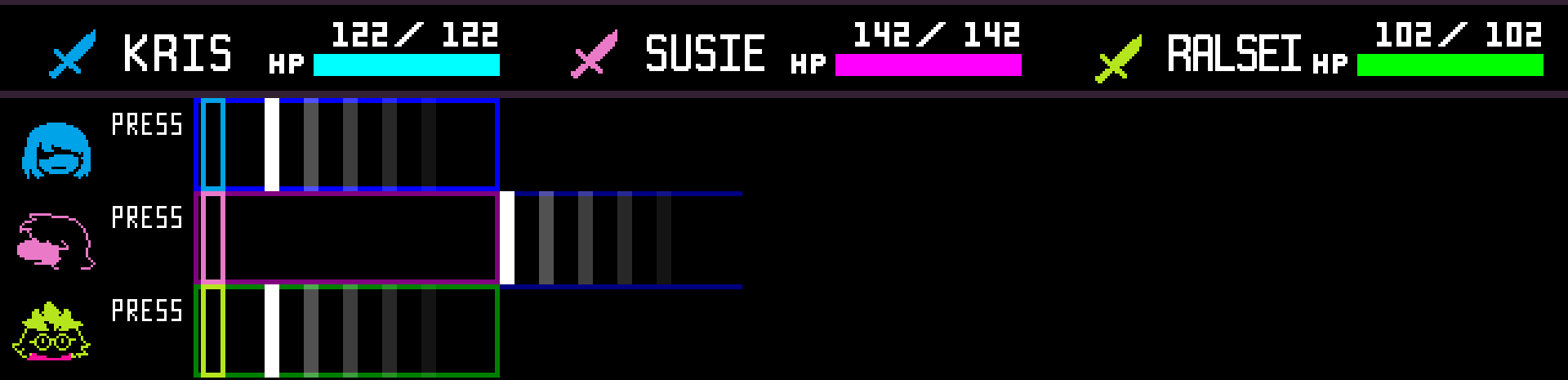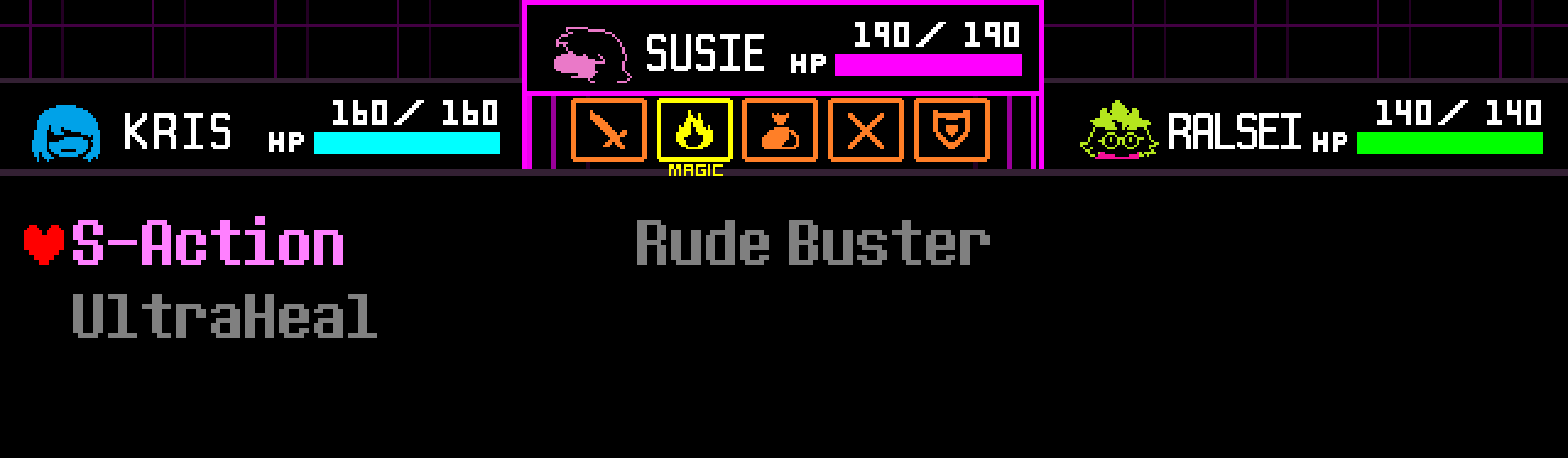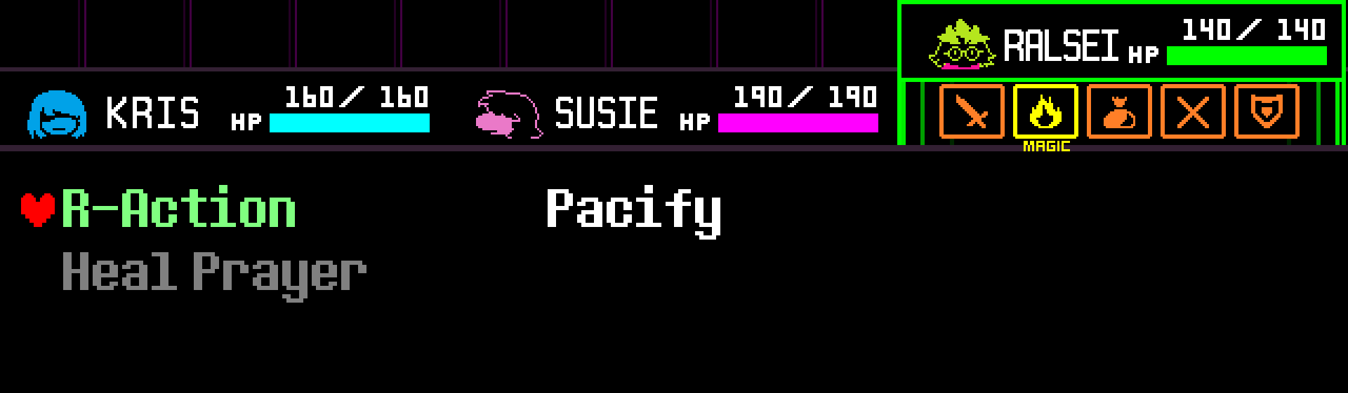 Starting from the middle of Chapter 2, Susie and Ralsei gain the ability to use a singular 'ACT' on each enemy from their Spell Menus. Make sure to make the most of these moves – if you don't, battles will take considerably longer.