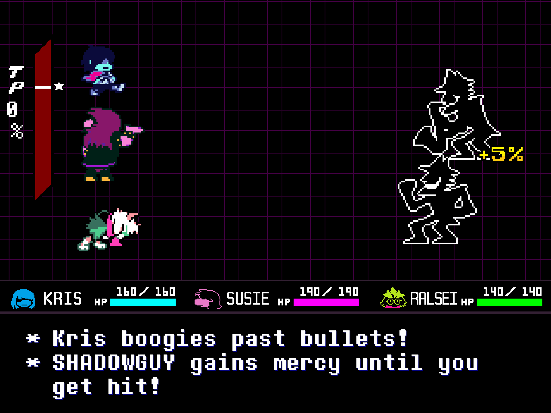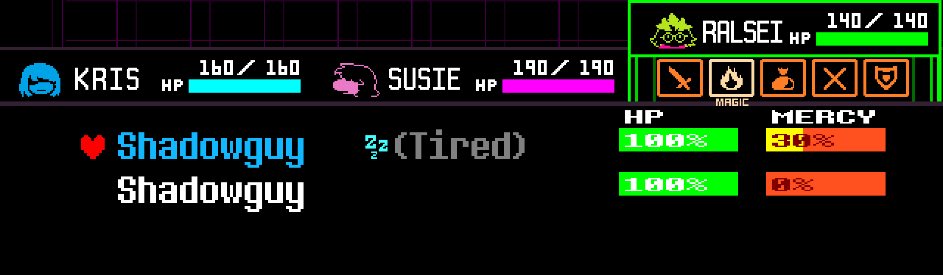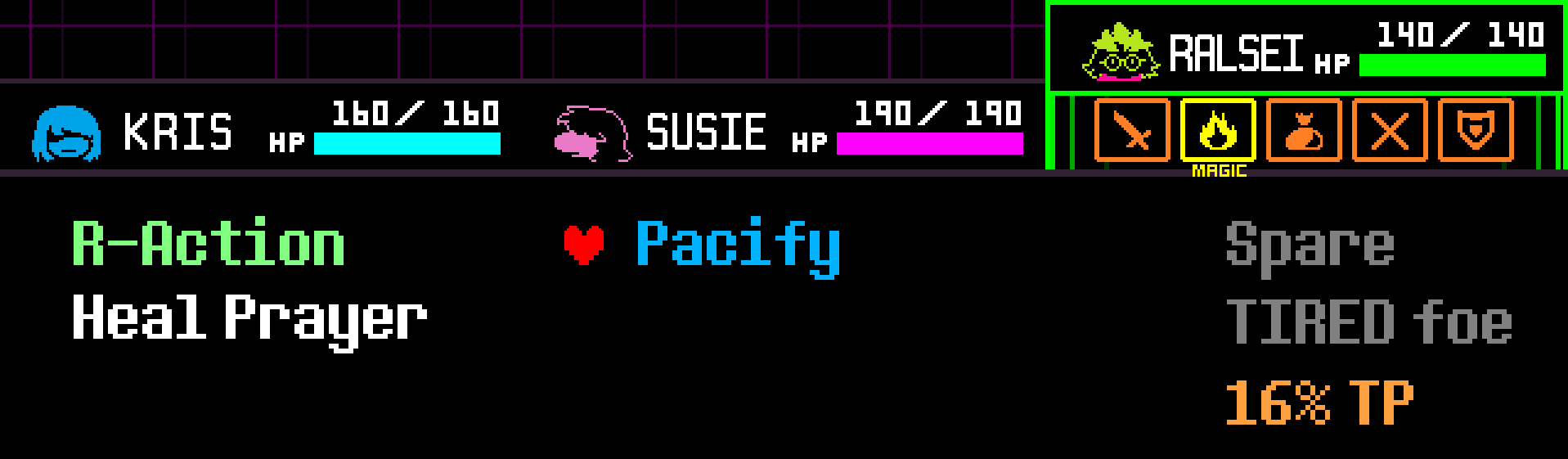As a result of certain ACTs or losing a portion of its HP, an enemy can become TIRED. Ralsei's PACIFY spell will be able to defeat this enemy nonviolently. (However, you need to have at least 16% TP to use the spell.)