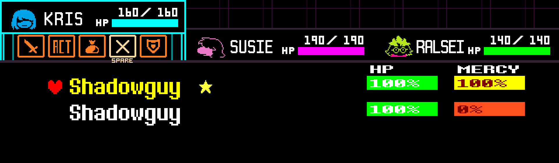 As an enemy is targeted by ACTs, it will display % MERCY gained. Once the enemy reaches 100% MERCY, using the SPARE command defeats the enemy nonviolently.